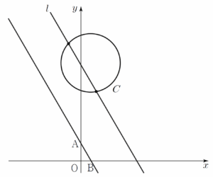 직선 $\mathrm{AB}$와 평행한 직선 중에서 원 $C$의 중심으로부터의 거리가 $|5-h|$이고 직선 $\mathrm{AB}$와의 거리가 $h$인 직선을 $l$이라 하자.