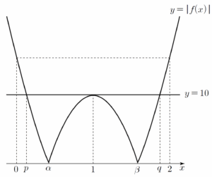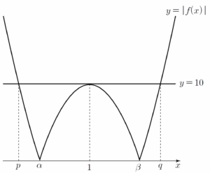 이고 함수 $y = |f(x)|$의 그래프와 직선 $y = 10$이 만나는서로 다른 세 점 중 $x$좌표가 $1$이 아닌 두 점의 $x$좌표를 각각 $p$, $q$ ($p \lt q$)라 하면 함수 $y = |f(x)|$의 그래프는 그림과 같다.