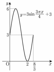 함수 $y = f(x)$의 그래프는 $y = 3 \sin \frac{\pi x}{a}$의 그래프를 $y$축의 방향으로 $b$ ($b \gt 0$) 만큼 평행이동한 것이고 함수 $y = f(x)$의 그래프가 $x$축과 오직 한 점에서 만나므로 함수 $f(x)$의 최솟값은 $0$이다. 함수 $f(x)$는 $x = \frac{3a}{2}$일 때, 최솟값 $0$을 가지므로 $\frac{3a}{2} = 2$, $a = \frac{4}{3}$이고