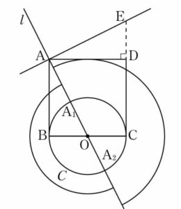 선분 $\mathrm{BC}$를 지름으로 하는 원을 $C$, 점 $\mathrm{A}$를 지나면서 직선 $\mathrm{AE}$에 수직인 직선을 $l$이라 하자.
