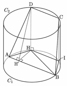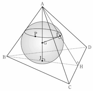 정삼각형 $\mathrm{ABH}$의 내접원이 선분 $\mathrm{BH}$와 만나는 점을 $\mathrm{J}$라 하면 세 점 $\mathrm{A}$, $\mathrm{G}$, $\mathrm{J}$는 한 직선 위에 있고, 두 평면 $\mathrm{ABH}$와 $\mathrm{BCD}$가 서로 수직이므로 평면 $\mathrm{BCD}$와 직선 $\mathrm{AJ}$는 서로 수직이다.