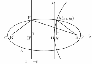 점 $\mathrm{A}$에서 $x$축에 내린 수선의 발을 $\mathrm{A}’$, 직선 $x = -p$가 $x$축과 만나는 점을 $\mathrm{H}’$이라 하면 타원 $E$는 선분 $\mathrm{A’H’}$의 중점을 지나고 $x$축에 수직인 직선에 대하여 대칭이므로