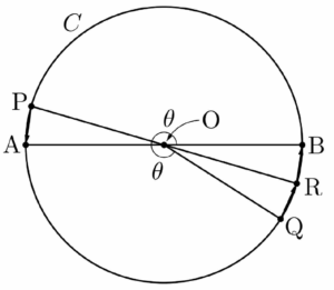 즉, 두 벡터 $\overrightarrow{\mathrm{OP}}$와 $\overrightarrow{\mathrm{OQ}}$가 이루는 각의 크기는 두 벡터 $\overrightarrow{\mathrm{OB}}$와 $\overrightarrow{\mathrm{OP}}$가 이루는 각의 크기 $\theta$와 같다. 이때 $|\overrightarrow{\mathrm{OB}}| \gt 0$이므로 점 $\mathrm{Q}$는 점 $\mathrm{B}$와 일치하지 않고, 따라서 네 점 $\mathrm{A}$, $\mathrm{B}$, $\mathrm{P}$, $\mathrm{Q}$는 그림과 같다.